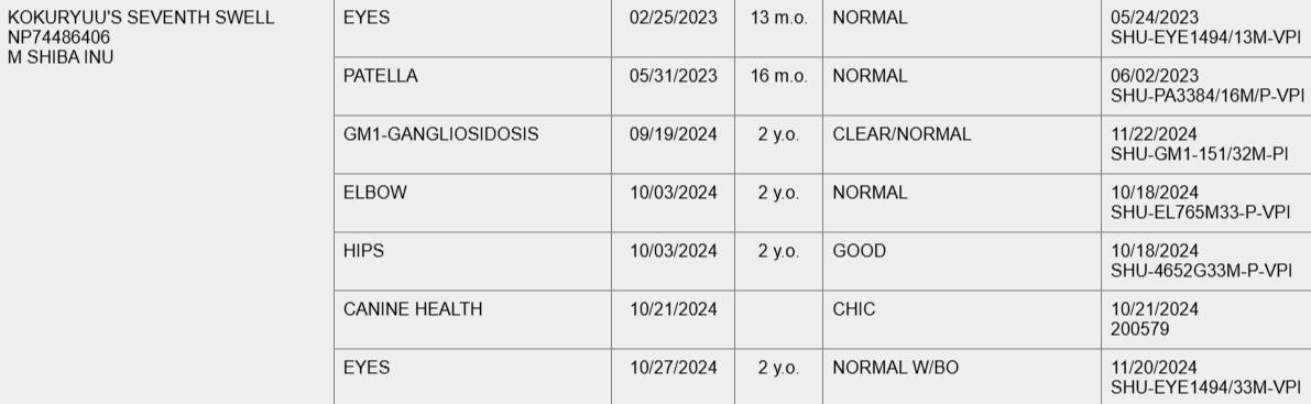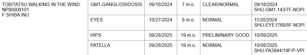Byakko has completed all of her required health testing. OFA Hips are preliminaries and will not show up publicly on OFA's database.